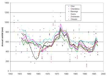 Figure 6 5-year running averages of annual rainfall totals in the Runde catchment at Chendebvu, Chiredzi, Chivi, Gweru, Masvingo and Zvishavane.