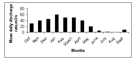 Figure 7 Annual discharge at the Runde discharge gauge station, Masvingo. The change in mean daily discharge rate, m3/s in the Runde River (Source: Department of Water and hydrology, 2010).