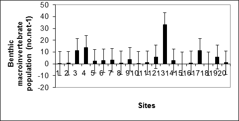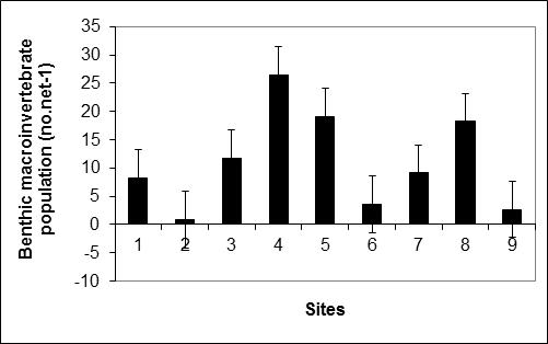 A t test of the mean density (no.m2), however, did not show significant differences (p>0.05) above and below effluent outfall suggesting that BM settlement areas may not be explained in terms of nutrient concentrations. Attempts to explain distribution of species in terms of chemical differences may not always have much success except where conditions are extreme. BM density (no.m-2) response to perturbation certainly does not support the notion that the Runde River is severely polluted by the upstream agricultural activities. Vesilind and Weiner suggests that benthic community responses to environmental perturbation are useful in assessing the impact of agricultural wastes. BM were abundant in all streams, but communities did not reflect degraded conditions; noninsect groups, mostly Mollusca, Hemiptera and Odonata dominated density and mollusks, mostly Planorbidae and Corcubilidae, dominated biomass. Of insects, mostly Odonata, dominated density and Hemipterans were important contributors to biomass.