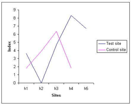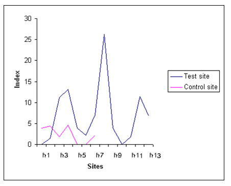 Figures 10,11 shows that the BM Margalef index for the control sites was lower than that of the test sites suggesting differences in nutrient levels and sources. The Margalef index measures species richness and it tries to compensate for sampling effects.25 For other commonly used diversity indices such as Shannon index24 the proportions and not absolute numbers are considered. No significant differences were found in the Shannon index for BM between the control and test sites in all the study periods (Table 3).
