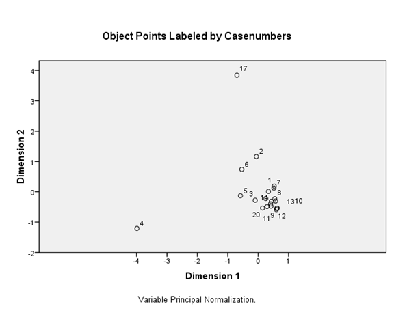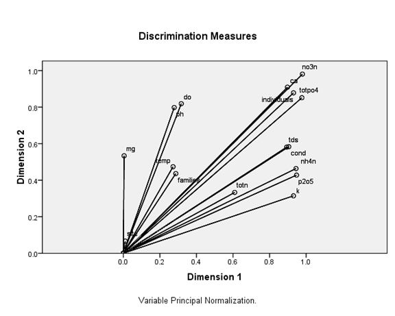Multiple Correspondence Analysis (MCA),24 examined the direct and indirect effects of a gradient in nutrient concentration and hydrologic disturbance on benthic community structure in the study area. Model results should indicate the relationship between nutrient concentration, physico-chemical characteristics, and benthic fauna. The results should imply the direction of the response of stream benthic communities to nutrient stimulation. The Correspondence procedure was used in SPSS25 to identify the two strongest underlying factors in the relationships between the water quality variables. By assigning each variable a specific number within each dimension, the information was displayed in an easily understood chart, commonly called a perceptual map.