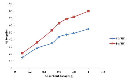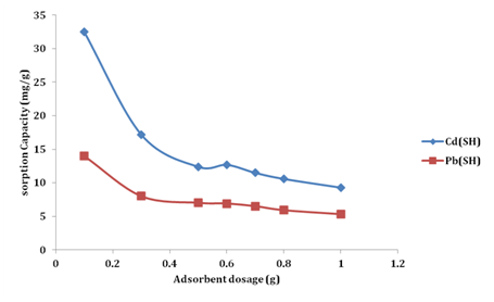 The physico-chemical parameters of SH viz; pH, % Moisture Content, % Loss of mass on ignition, Bulk density (g/cm3), Particle sizes and pore size (μm). The values reported are in the range with those reported in the literature.14,22 The adsorption of heavy metals from wastewater is influenced by several physical and chemical factors, such as pH, temperature, initial heavy metal concentration, adsorbent dose, adsorbent particle size, ionic strength, co-ions, etc. These factors determine the overall adsorption process by affecting the metal uptake rate, selectivity and amount of heavy metals removed.8 Adsorbent dosage has proved to be a useful parameter for determining the capacity of a adsorbent for a given initial metal ion concentration. The percentage removal of Cd(II) and Pb(II) ions in this study, increased with increasing adsorbent dosage (Figure 4).23-25 Increasing the dose from 0.1 to 1.0 g led to an increase in percentage removal of Cd(II) from 34.3 to 65.0% on BGH and 21.6 to 61.7% while percentage removal of Pb(II) increased from 21.0 to 80.0% on SH . This is due mainly to an increase in the number of available exchangeable binding sites for metal ion sorption.26,27 The equilibrium sorption capacity per unit mass of the adsorbents decreased considerably with increase in sorbent dose for both metal ions (Figure 5).28 Increase in biosorbent dosage led to a decrease in the equilibrium sorption capacity of Cd(II) from 32.5 to 9.3 mg/g on while that of Pb(II) decreased from14.0 to 5.3mg/g on SH. This may be due to a decrease in the total sorption surface area available to the metal ions, possibly caused by the aggregation/agglomeration of sorption sites, as a result the sorption capacity of the adsorbent is not fully utilised.29,30 Conversely, a higher adsorbent dose may provide more active sorption sites, so that adsorption sites remain unsaturated during sorption, leading to their full utilization.31,32