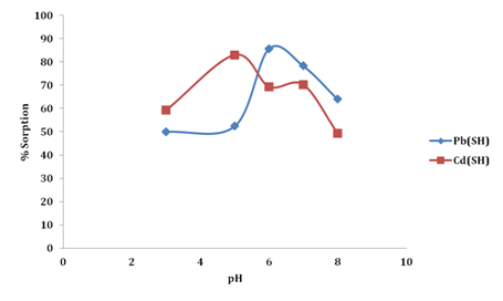 The percentage removal and equilibrium sorption capacity of metal ions is strongly affected by pH.33 At the same time, the state of chemically binding sites is changed by the solution pH .16 Sorption of both metal ions increased with increasing pH, significant percentage removal (65.1 to 92.3 %) occurred at pH 6-8 (Figure 6). An optimum pH of 6.0 was achieved for both Cd (II) and Pb(II) with percentage removal of 83.0% and 85.7% respectively on SH. At low pH, higher concentration and mobility of H+ ions favours H+ sorption compared to metal ions, this creates a competition between the protons and metal ions for the binding sites of the adsorbent. According to Onundi et al. 20 metal ions are more soluble in solution at lower pH values and this reduces their sorption. The low sorption at low pH in this study (Figure 6) was therefore due to saturation of binding sites of sorghum husk with hydrogen ions. However, an initial metal sorption observed with increase in pH was due to a decrease in competition between hydrogen ions and metal ions for the adsorbent surface binding sites and also due to decrease in positive surface charge, which resulted in less electrostatic repulsion between the surface and metal ions before ion exchange which is the major mechanism of metal uptake.20 As the pH of the solution increases, more negatively charged surface becomes available thus facilitating greater metal adsorption. Similar tendencies were found in adsorption processes using diverse agricultural waste biomass (AWBs). Giri et al. 34 reported a similar trend on studies of the effect of pH on the removal of Cr (VI) using Eichhornia crassipes root activated carbon. However, at higher pH metal ions tend to precipitate out of solution. Therefore the removal of metal ions at higher pH values is due to the formation of metal ion precipitates rather than sorption.35,36