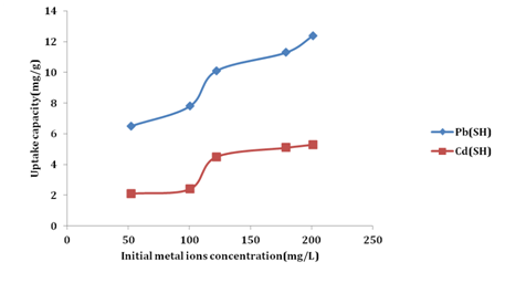 The effect of initial concentrations of metal ion on adsorption was examined under optimum conditions by mixing 1g SH powder with 50 ml of Cd(II) and Pb (II) ion solutions of different initial concentrations ranging from 50 to 200 mg/l at pH of 6.0. The experiments were conducted at a temperature of 25 ±1°C, shaking rate of 180 rpm for 120 mins. The samples were finally filtered and analysis for residual metal ions by an atomic absorption spectrophotometer (Buck Scientific, model 210VGP).