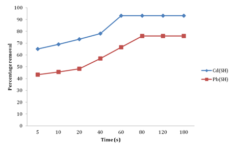 The amount of metal ions sorbed is a function of the initial concentration of the metal ion, making it an important factor in effective adsorption. The sorption capacity of adsorbent (SH) for metal ions sorption in this study increased with increasing metal ion concentration. In Figure 7 the sorption capacity of Cd (II) and Pb(II) increased from 2.1 to 5.3 mg/g and 6.5 to 12.4 mg/g respectively as metal ion concentrations was increased from 52.5 to 201mg/L. This resulted to an increase metal ion concentration gradient which overcomes the resistance to mass transfer of metal ions between the aqueous phase and the adsorbent.37 A higher concentration in a solution implies a higher concentration of metal ion to be fixed on the surface of the adsorbent.31 Dawodu FA et al. 16 reported a similar observation on simultaneous adsorption of Ni(II) and Mn(II) ions from aqueous solution onto a Nigerian kaolinite clay. High metal concentration saturates the adsorbent sites more quickly thereby decreasing the overall percentage metal removal. A similar trend was observed by Kannan N et al. 38 The removal rate of metal ions also increases with an increase in contact time (Figure 8). The rate of adsorption is higher at the early stage, due to a large available surface area on the adsorbent and presence of abundant binding sites on the surface. The fast initial uptake is also due to the rapid accumulation of the heavy metal ions on the surface of the adsorbent. As these sites become exhausted or saturated with time the sorption rate also decreases. In this study Equilibrium sorption was achieved within 60 minutes for Cd(II) and 80 minutes for Pb(II) ions in the batch process, after which the rate of sorption became fairly stable. According to Dawodu FA et al..16, during initial stages, sorption is controlled mainly by diffusion from the bulk solution to the surface of the adsorbent, whereas subsequent sorption rate is controlled by the rate at which the adsorbate is transported from the exterior to the interior sites of the adsorbent particles, hence more time will then be consumed on diffusion of metal ions to binding sites which is probably an attachment-controlled process due to the presence of fewer binding sites.10 The faster removal rate of Cd(II) than Pb(II) may be due to the smaller ionic radius of Cd(II) (0.91°A) than Pb(II) (1.91°A), which makes for easier, more rapid diffusion to the surface of the adsorbent.16