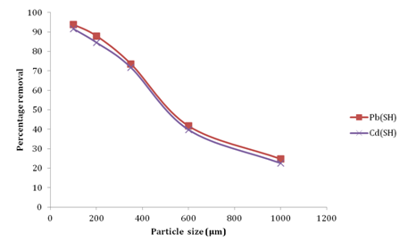 To each separate 50 ml portion of 200 mg/l of Cd(II) and Pb (II) ions solution in 100 ml plastic bottle, biomass particles of different sizes ranging from 1000 to <250μm were separately added. The mixtures were agitated over a shaker at 180 rpm for 120 mins at a temperature of 25±2°C, pH of 6.0. The mixtures were finally filtered and analyzed for residual metal ions an atomic absorption spectrophotometer (Buck Scientific, model 210VGP). In each experiment, one parameter was varied while the others were kept constant. The solution was filtered at the end of a given contact time, and the concentration of metal ions remaining in the filtrate was determined by an atomic absorption spectrophotometer (AAS) Buck Scientific, model 210VGP. Each experiment was performed twice; and the mean value was computed to minimize error. The amount of metal ions sorbed per unit mass of the adsorbent was calculated using equations 1 and 2:17