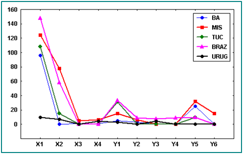 In the present research, we used a data matrix with a total number of 879 larvae, i.e., an average of 207.4 larvae per population. The X1 chromosome is, by far, the most abundant one in all sites. Its frequencies are in-creased in [BA] and [TUC] but decreased in [URUG] due to interaction effects (Table 3). The X2 variant is also a very frequent chromosome although not as predominant as the X1: it was not found in [BA] (Table 1). The (ucs(jj)) was estimated in -2.7776 indicating a de-creased frequency in the order of hundreds with respect to the average frequency) and it had a statistically significant increased frequency in [BRAZ] and [MIS]. Chromosomes X3 and X4 are the rarest. Chromosome X3 was found only in [BA] and [MIS] and did not show any significant interaction. Chromosome X4 was found in [BA], [MIS] and [URUG]; it showed a positive significant interaction effect in [URUG] (Table 3).