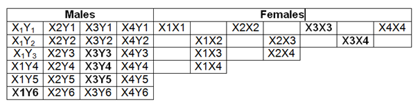 Samplings allowed determination of variant frequencies. Some of them could not be de-tected probably due to sample effect. The fact that the X3 is in low frequency, determines the low probability of X3Y3, X3Y4, X3Y5 combinations. Even though X3 and Y6 were in very low frequency, a combination X3Y6 is detected due to high positive Y6-MIS interaction. Negative interaction is the cause for the low probability of detecting some variants. This is the case for X1Y6, which shows negative interaction with locations.