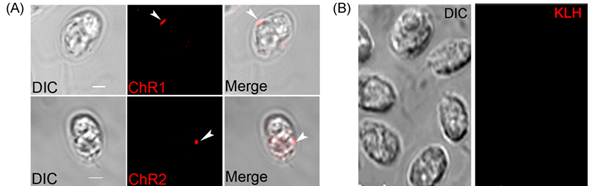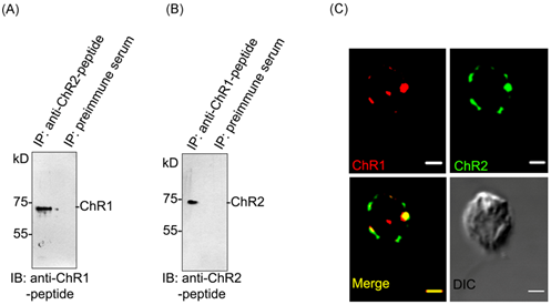 A. Cellular localization of ChR1 and ChR2 using respective peptide antibodies. Red fluorescence at eyespot represents ChR1 and ChR2 in upper and lower panel, respectively