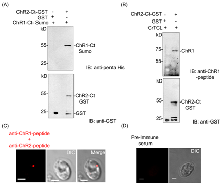In order to find whether the extended C-terminal (Ct) regions of ChR1 and ChR2 participate in interaction between ChR1 and ChR2, we performed the GST pulldown studies. C-terminal region of ChR1 (960-2136 bp) with N-terminal 6XHis-Sumo tag and ChR2 (945-2211 bp) with N-terminal GST tag were heterologously expressed in E. coli. Sumo-tag assists the solubility of ChR1 protein expressed in E. coli. The affinity purified ChR2-Ct-GST was used as a bait to pull down ChR1-Ct-6XHis-Sumo. Recombinant GST was used as bait in negative control experiment, performed under similar conditions. The presence of ChR1-Ct-6XHis-Sumo in the pull-down elutions was identified by immunoblotting with penta-His antibody. ChR1-Ct-Sumo was pulled down with ChR2-Ct-GST but not with recombinant GST (Figure 4A; upper panel). The presence of bait proteins (GST and ChR2-Ct-GST) in pulldown reaction were confirmed by immunoblotting with GST antibody (Figure 4A; lower panel). Thus pull-down assay showed that ChR2-Ct could directly interact with ChR1-Ct protein, in in-vitro conditions. To confirm whether the C-terminal region of ChR2 is sufficient to bind full length ChR1 protein, GST-pulldown of ChR1 protein from total cell lysate of C. reinhardtii was performed using ChR2-Ct-GST as bait and recombinant GST as negative control. Immunoblotting analysis of proteins bound to ChR2-Ct-GST and that to recombinant GST (negative control) with ChR1-peptide antibody showed the binding of ChR1 with ChR2-Ct-GST but not with recombinant GST protein (Figure 4B; upper panel). Immunoblotting with GST antibody confirmed the presence of bait proteins (GST and ChR2-Ct-GST), in respective lanes (Figure 4B; lower panel). The possibility of direct interaction between the ChR1 and ChR2 proteins was further confirmed by proximity ligation assay (PLA) using ChR1 and ChR2-peptide antibodies. The pre-immune serum of the animals (rabbit and mice, respectively) in which respective antibodies were generated, these were used as negative control for PLA, respectively. The presence of red fluorescence spot near the eyespot of C. reinhardtii cells suggested the possibility of the direct interaction between ChR1 and ChR2 (Figure 3C). The absence of any fluorescence signal in negative control experiment under similar experimental conditions served as negative control (Figure 3D). Thus, the proximity ligation assay of ChR1 and ChR2 strongly supported the interaction of these proteins in the eyespot of C.reinhardtii.