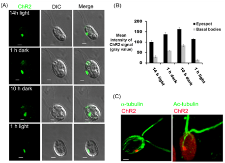 In order to find out the interaction between ChR1 and ChR2, we utilized specific antibodies against the ChR1 and ChR2 proteins and established direct interaction between these two proteins via their C-terminus regions in the C. reinhardtii cell. In this report, we also established that the cellular distribution of ChR2 in Chlamydomonas is not confined to the eyespot only. That is, the cellular localization of ChR2 in C. reinhardtii is a light dependent process and it shuttles between the eyespot of Chlamydomonas to the basal bodies in light dependent manner. Moreover, like ChR1, which was earlier reported to be associated with the highly acetylated D4 rootlet in C. reinhardtii cells.19 In this study, ChR2 photoreceptor was also found to associate with D4 rootlet in C. reinhardtii cells.
