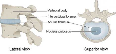 The image illustrates the key structures of the intervertebral discs, showcasing both the lateral and superior views. These critical components include the vertebral body, the intervertebral foramen, the anulus fibrosus, and the nucleus pulposus.