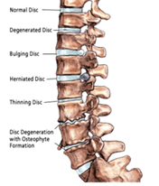 The image illustrates various types of disc problems that can impact the intervertebral discs. These issues include degenerated discs, bulging discs, herniated discs, thinning discs, and disc degeneration accompanied by the formation of osteophytes.