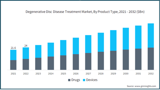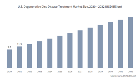 Looking specifically at the market in 2022, as shown in Figure 3,12 the degenerative disc disease treatment sector accounted for 24 billion USD, and experts anticipate a CAGR of 7.2% that would lead to a market size of 49.7 billion USD by 2032.1 These statistics demonstrate sustained growth and highlight the potential market opportunities within the degenerative disc disease treatment sector.