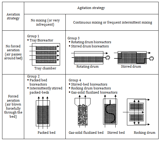 Within strategy two, three mixing types can be used on the fermented beds: static (unmixed), intermittently mixing (agitated), or continuous mixing (agitated). For both strategies, dry air or saturated air can be used. According to Mitchell et al.99,100 SSF bioreactor designs can be classified into four groups (Figure 1), which can be separated by aeration and mixing type: