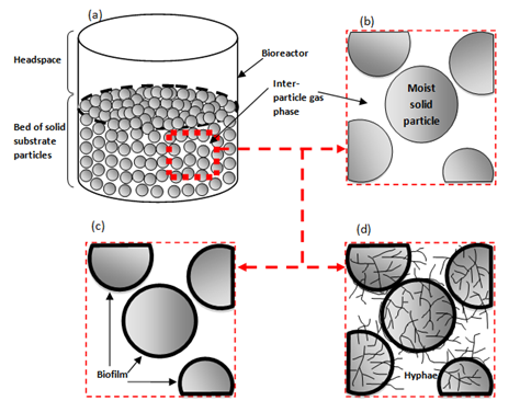 Micro-scale phenomena: Micro-scale phenomena are of great interest because they are a major disadvantage of SSF. Figure 9 shows the schematic of some micro-scale phenomena that happen during SSF (as illustrated by Hölker et al.127 SSF has three major phases: which are the solid, gas and liquid phase. These phases make the process quite complicated and varied. Following this thought, microorganisms have a limited access to nutrients contained in the solid substrate, oxygen, water, enzymes and also limited carbon dioxide and heat removal. This will lead to poor growth, reduced bioreaction rates, low productivity and poor performance of the bioreactor system due to these limitations. In this situation, where SSF involves the use of fungi, mass transfers in micro-scale phenomena can be classified into four categories: