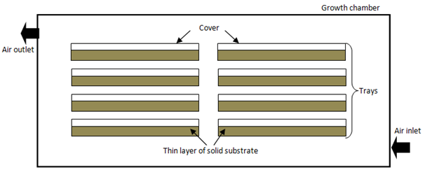 Thickness of solid substrates bed can be varied. Usually trays are place in the incubating room, where temperature and humidity are controlled for optimal growth. Trays are arranged one above the other with suitable gaps between them. Tray design has not changed majorly.22 Zhang Chen et al.105 studied the effect of two dynamic changes of air (including air pressure pulsation and internal air circulating) in a tray bioreactor and observed changes in the temperature gradient. In their results, internal air circulation was beneficial, accelerating heat transfer between the substrate surface and the outside air. Furthermore, Ruiza et al.106 and Assamoi et al.82 designed column-tray bioreactors with forced aeration. This allowed better control of environmental conditions in the bed due to manipulation of temperature and flow rate of the air. Figure 3 shows general schematic multiple tray fermenters.