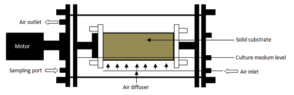 Rotating drum bioreactors: Rotating drums bioreactors mix intermittently without forced aeration, operating on continuous or semi-continuous mode. A rotating drum bioreactor is a horizontal cylinder. The drum is semi-filled with a bed of substrate. The fermented bed cannot be too high and this creates good oxygen and carbon dioxide transfer.101 Nava et al.80 found even at small scale that temperature control in drum bioreactors is quite difficult. Solid substrate is mixed differently for different microorganisms. Mixing could be continuous, intermittent or mixed. This prevents metabolic heat generated by microbial activity accumulating. Temperature control also depends on the mixing effect on the solid substrate.109 Air also could be blown through the headspace. Also in forced aeration, conditioned air is passed through the bed. Metabolic heat is removed from the bed, transfers into headspace by diffusion or through the conductive wall to the environment.110 During intermittent mixing, growth of the microorganisms is found to be more even and less damaging to fungal mycelium.97,111 Continuous mixing could increase damage to fungal mycelium, affecting microorganism growth. Stuart and Mitchell112 observed the operating variables of the rotating drum bioreactor when growing Aspergillus oryzae. They found that the growth rate decreased when rotational speed increased because of shear forces. Ali et al.110 suggest two possible ways to address these problems: