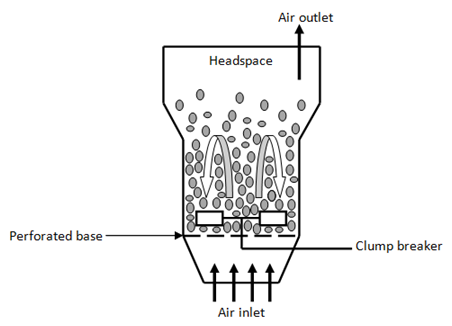 Fluidized-bed bioreactors: Typically, fluidized-bed bioreactors are constructed from a vertical chamber with a perforated base plate. Forced aeration is applied at the bottom chamber at sufficient speed to fluidize the solid substrate particles and cause mixing. Also, the bioreactor has an agitator (clump breaker), breaking up agglomerates that can form and settle to the bottom.113 The bed expands and so enough headspace is needed.97 The mixture of solid particles and gas will behave like a liquid. This fluidized-bed bioreactor provides a good mixing behavior of gas, solid and liquids.23 Evaporating water can cool the biomass.114 The substrate properties of gas-solid fluidized-bed bioreactors influence bioreactor effectiveness. For example, a sticky substrate will form large agglomerates (clumps), which cannot be fluidized.110,115,116 In order to fluidize all, the solid substrate should have the same particles size. With size differences, some small size particles might fluidize and the large particles size might not fluidized.117 There is no problem with controlling the temperature and cooling the substrate bed, because high flow rates for fluidization should provide a large enough convective cooling capacity.115,116 and good rate of heat and mass transfer.23 However, mixing steps in fluidized bed could damage the penetrative mycelium of the fungus because fungi are affected by hard force.100 The design scheme of the fluidized-bed bioreactor can be seen in Figure 6.