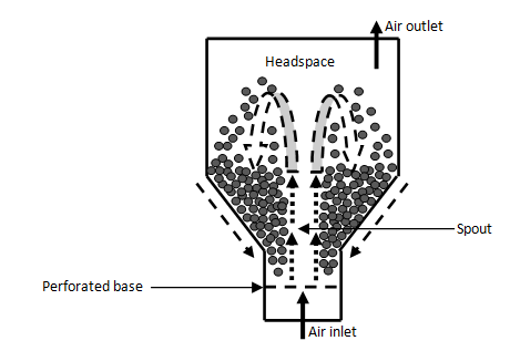 Spouted-bed bioreactors: In spouted-bed bioreactors, air is only blown upwards through the central axis of the solid bed. As a result, only part of the bed is fluidized and the bed can be expanded. Due to the vigorous contact between gas and solids, solids slip down the bottom of bioreactor due to its sloped sides and solids cycle continuously.99,100,118 The advantage of the spouted-bed bioreactor is that it prevents particles agglomeration caused by high-speed impacts in the spouted-bed’s core region.23,1119 This is suitable for handling solids, which have sticky nature, irregular texture or size distribution that cannot be treated in fluidized-bed bioreactors.118 Also spouted-bed bioreactors are able to handle large coarse solid particles, different densities and shapes,120 which are related to solid substrate for the SSF process. Furthermore, spouted-bed bioreactors have other advantages for mass and heat transfer. This is because exceptional mixing of solid substrates in the bioreactor creates high mass and heat transfer rates.118,119,121,122