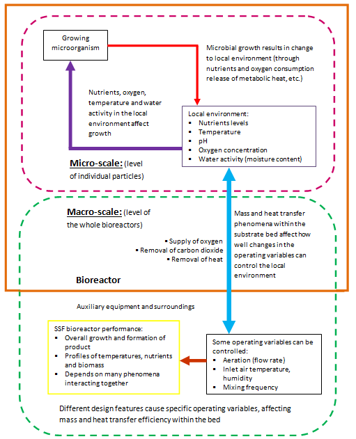 Performance of SSF depends greatly upon issues such as mass transfer phenomena and bioreaction rates, as well as effective bioreactors system design and operation. ‘Micro-scale’ and ‘macro-scale’ are used to describe mass transfer within the SSF bioreactor system. Figure 8 shows the relationship between micro-scale and macro-scale phenomena. According to Mitchell et al:4