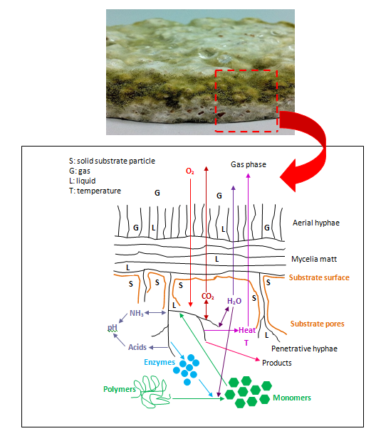 Generally mass transfer phenomena in SSF are not easy to measure, because different phenomena take place at the same time. Also, the relative importance of phenomena changes with bioreactor type, scale and other factors.126