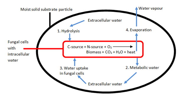 Intra-particle mass transfer: Intra-particle mass transfer concerns transfer of nutrients and enzymes inside solid substrate particles. Here, the main issue is the diffusion of oxygen needed in metabolic respiration. Oxygen is consumed and carbon dioxide, water, heat and other products are produced. Additionally, the substrate containing the biomass produces enzymes, other polymers and secondary metabolites. The growing microorganisms secrete further enzymes, which help in the biodegradation of solid substrate particles. According to Mitchell et al.135 there are three steps of intra-particle mass transfer: