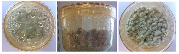 Figure 2B gives the micro-scale overview of un-inoculated substrate. This can be known as solid phase. At this scale, moist solid substrate particles hold important nutrients and growth factors. Space between solid substrate particles known as void fraction, is filled with water and gas. Furthermore, the gradients of nutrients, oxygen and water will affect microbial growth. Figure 2C gives an overview of bacterial or yeast cultures growing and sticking to surfaces of the solid substrate particles, shown by the thick black layer at the particle surface. Figure 2D gives an overview of filamentous fungi growing by sticking to the surface and hyphae. Therefore, mycelium able to deeply penetrate into solid substrate particles to consume nutrients, oxygen, excreting metabolites and enzymes. At a small scale level, petri dishes and Erlenmeyer flasks can be used as laboratory scale bioreactors for SSF. Conditions are entirely aseptic, making this an advantage of using laboratory scale bioreactors. However, the disadvantage is that agitation and aeration cannot be carried out. Many industrial bioreactors have been designed. However, they have problems of sterilisation, substrate loading, heat generation, heat removal and handling difficulties.