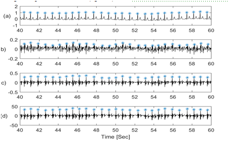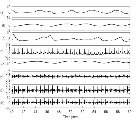 Figure 2 shows the physiological signals with their upper and lower envelopes suggesting that baseline and amplitudes of these signals noticeably vary with respiration.