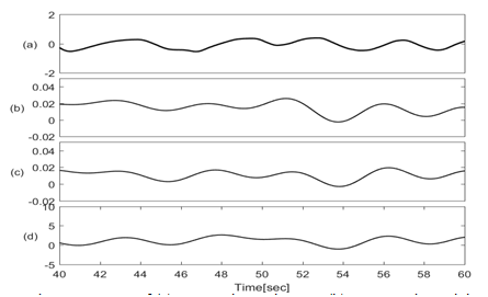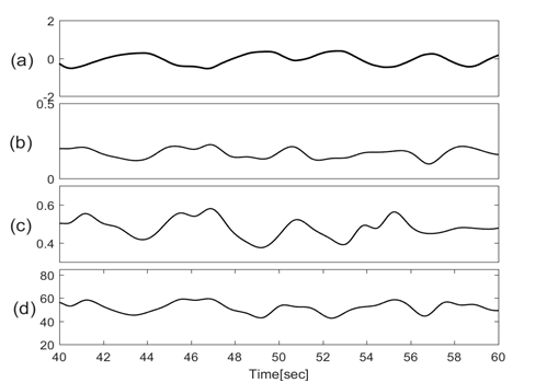 Figure 4 Traces of (a) Lung volume changes; (b) Amplitude modulation of SCG-craniocaudal; (c)Amplitude modulation of SCG-lateral; (d) Amplitude modulation of SCG-dorsoventral.