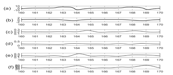 Figure 5 Traces of (a) Flow (b) Lung volume (c) amplitude modulation from ECG (d) amplitude modulation from SCG-craniocaudal (e) amplitude modulation from SCG-lateral (f) amplitude modulation from SCG-dorsoventral signal.