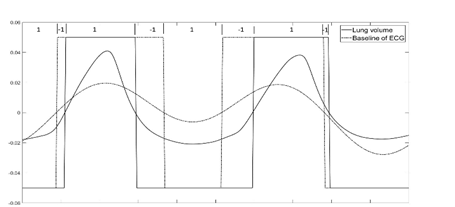 Figure 7 Traces of reference signal (Lung volume change) and test signal (baseline wondering of ECG) plotted along with their sign. The sign of each signal is also plotted, and the Sign match index is shown on the top of the graph. A Sign match index > 0 shows the region of phase match between the signals while a negative value indicates phase mismatch.