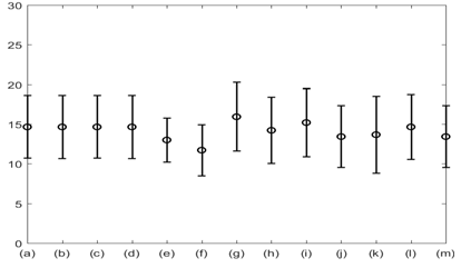 Figure 8 Average respiratory rate with standard error for: (a) Lung volume change; (b) Chest wall movement; (c) GSR; baseline wonder of: (d) SCG-craniocaudal, (e) SCG-lateral, and (f) SCG-dorsoventral; amplitude modulation for: (g) SCG-craniocaudal; (h) SCG-lateral; and (i) SCG-dorsoventral; and frequency modulation for: (j) ECG, (k) SCG-craniocaudal, (l) SCG-lateral, and (m) SCG-dorsoventral signal for all 12 subjects. The average respiration rate was found to be around 14 with a standard error of 4 breath per minute.