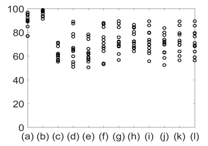 Figure 9 %Phase match between the reference signal (lung volume) and other signals. (a) Chest wall movement; (b) GSR; baseline wonder of: (c) SCG-craniocaudal, (d) SCG-lateral, and (e) SCG-dorsoventral; amplitude modulation for: (f) SCG-craniocaudal, (g) SCG-lateral, and (h) SCG-dorsoventral; and frequency modulation for: (i) ECG, (j) SCG-craniocaudal, (k) SCG-lateral, and (l) SCG-dorsoventral signal for all 12 subjects. The phase match with the reference signals was highest for GSR.