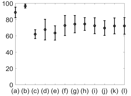 Figure 10 Mean and standard deviation of %Phase match for: (a) Chest wall movement; (b) GSR; baseline wonder of: (c) SCG-craniocaudal, (d) SCG-lateral, and (e) SCG-dorsoventral; amplitude modulation for: (f) SCG-craniocaudal, (g) SCG-lateral, and (h) SCG-dorsoventral , and frequency modulation for: (i) ECG, (j) SCG-craniocaudal, (k) SCG-lateral, and (l) SCG-dorsoventral signal for all 12 subjects. The chest GSR (b) had the highest ageement with the gold standard.