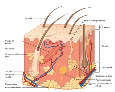 The skin’s functions of not only wound healing, but thermal regulation, tactile sensations, and pain sensations are performed by 3 tissue layers. The thin layer on the outside is the epidermis, while the thicker layer in the middle is the dermis. The innermost layer is the subcutaneous layer, also known as the hypodermis by Alexander Reyzelman. The epidermis is made up of keratinocytes that serve as a barrier to prevent loss of water and entry of microbes, and keratinocytes are responsible for reepithelialization. The dermis is connective tissue made up of mainly of collagen and elastic fibers that are produced by fibroblasts, and the dermis makes up a significant portion of the ECM. These two layers contain blood vessels, nerves, sweat glands, hair follicles, and cells that allow for immune function, growth, and repair of tissue, while overall giving the skin its strength and allowing for diffusion of nutrients and water. The hypodermis consists of a thick stratum of adipose tissue (Figure 3).