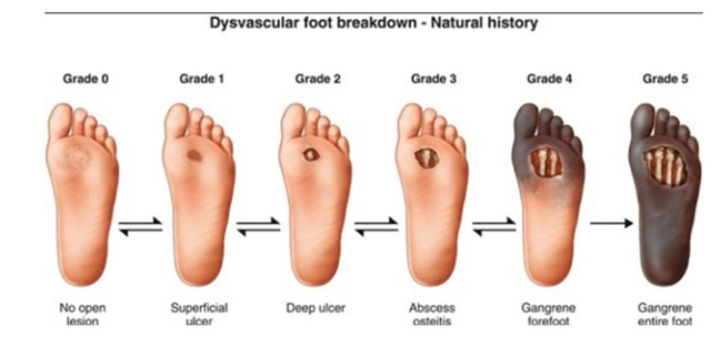 There is a spectrum of severity of DFU, and there are 6 classifications (Figure 5).14 Grade 0 is associated with foot symptoms, such as pain, and there is no clear wound yet.14 Grade 1 corresponds to presence of superficial ulcers and progression to grade 2 is characterized by deep ulcers. Grade 3 is when the wound has now involved the bone, and tendons and muscles will be exposed, and risk of infection is high. At grade 4, presence of dead tissue or gangrene is evident, particularly in the forefoot. In grade 5, the most severe grade, the entire foot is gangrenous.14