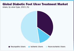 The market is also segmented based on ulcer type, where the three types are ischemic ulcer, neuropathic ulcer, and neuroischemic ulcer.16 Ischemic ulcers are primarily caused by insufficient blood flow to the foot, while neuropathic ulcers are due to nerve damage, so sensation is lost in the foot and can lead to damage.19 Neurosichemic falls in between the two.19 In 2021, the neuroischemic ulcers segment held the largest market share in the industry, accounting for over 50% (Figure 8).20 The market for this ulcer type is also expected to grow, likely due to the high risks related to neuroischemic ulcers, including infection, amputation, and mortality.46 In addition, neuro-ischemia affects around 50% of diabetics, so neuroischemic ulcers are the most prevalent type of DFU, and have higher associated costs of treatment.16,20 As an example, the National Center for Biotechnology Information wrote that the cost of ambulatory care treatment for a neuropathic ulcer is below 60 USD, while expenses for a bypass surgery for neuroischemic ulcer are almost 2000 USD.16,21 The segment of the market for ischemic DFU is expected to decrease, as there is a decrease in cases of purely ischemic DFU.20