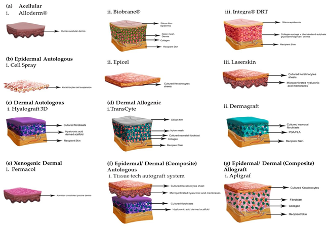 Skin substitutes are an effective alternative to using skin grafts, as they can serve as temporary covers to protect the wound bed and accelerate wound healing through releasing growth factors and cytokines.42 Ideally, a skin substitute should be sterile, nontoxic, have a low inflammatory response, allow for water vapor transmission, and act as a protective barrier.51 They must also adhere to the surface of the wound quickly, undergo controlled degradation, have sufficient structural properties, be easy to handle, conform to any wound surface, facilitate wound healing and vascularization, be inexpensive, have a long shelf-life, and have convenient storage options (Figure 15).51 While these are difficult requirements, many novel products are being made and studied that are paving the way for skin substitutes to potentially become a commonly available option.51 While the goal of skin substitutes is to model the structure and function of the normal skin, no substitute will completely replicate the skin, but there are many advanced options (Figure 16).