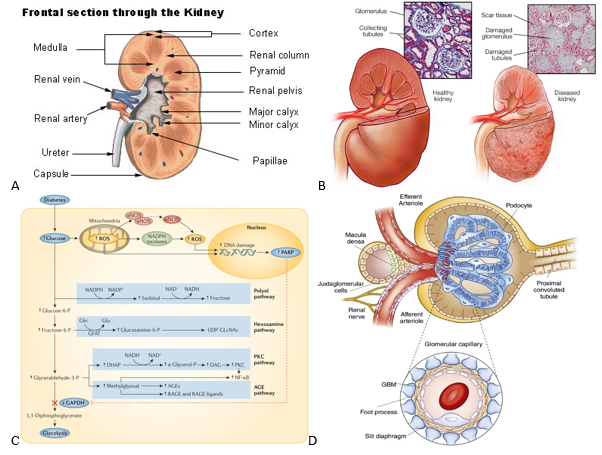 (a) Cross-sectional view of a healthy kidney is shown.8 (b) Histology slides and external view of healthy vs. damaged kidneys are shown.9 (c) Reactive oxygen species evolution is one of the main contributors to the damaging effects observed by diabetic nephropathy.11 (d) A cross-sectional view of the bowman’s capsule and its constituent glomeruli are displayed.14