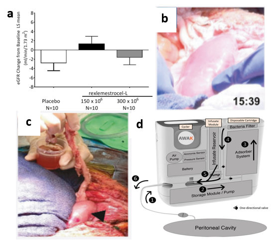Aside from the implantable kidney designed by UCSF, there are many bio-artificial kidneys in development but many have not yet reached human testing stages.48 Regardless, some devices have made it to clinical trials such as the automated wearable artificial kidney (AWAK).50 As shown in Figure 6d, the device works by first removing fluid from the peritoneal cavity of the patient.50 The fluid-dialysate mixture then passes through the adsorber system where sorbents remove toxins while the dialysate is regenerated.50 The dialysate is then drained at the end of therapy which can be up to 7 hours.50 Ultimately, 15 patients were chosen to undergo clinical trials during which serum urea, creatinine, phosphate, and serum β2-microglobulin levels were monitored.50 With AWAK therapy, levels of all these waste products were reduced; however, patients began experiencing adverse events (AEs) after about one month of therapy, most commonly abdominal pain/discomfort.50 Regardless, both the AWAK and implantable bioartificial kidney designed by UCSF are recent advances to an otherwise relatively stagnant field.50