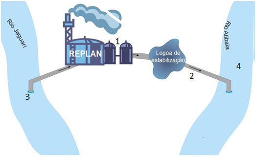 This study was performed at Paulínia Refinery (REPLAN/Petrobras) and two adjacent rivers. Wastewater samples were collected at the refinery from input point of the raw effluent for biological treatment, site 1 and output point of the effluent from stabilization pond, site 2. Water samples were collected from Jaguari River at the draw point of water for wastewater treatment (S 22°41’48’’/W 47°08’59’’), site 3 and from Atibaia River, upstream the disposal of the effluent (S 22°41’48’’/W 47º07’22’’), site 4. Sampling sites are shown in Figure 1. The samples collection and preservation were according to CETESB.9 Atibaia River belongs to class 2 according to CONAMA’s 357/05 Resolution. In this class, water can be used for human consumption after simplified treatment and recreational activities such as swimming and agricultural irrigation for vegetables and fruits growing close to the soil.