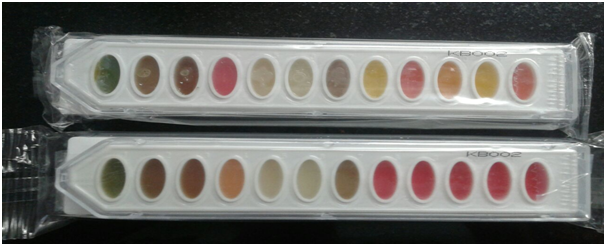 The test kits were open aseptically by peeling off the sealing tape. Each well of the test kit was inoculated with a loop of 24hrs old bacterial cultures by stab inoculation method6 and covered with peeled off sealing tape. The kits were incubated at 35-37°C temperature for 24hrs.