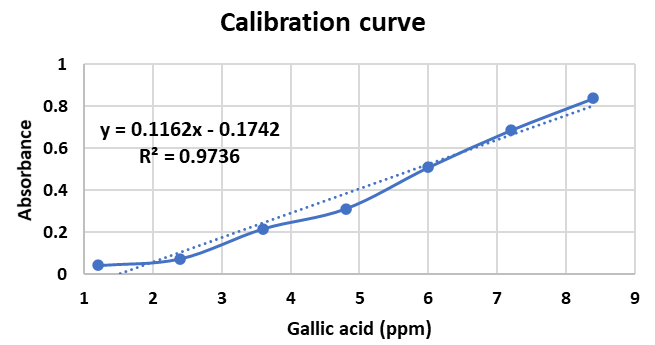 The free phenol content of each sample was calculated based on the individual absorbance data of the samples and the formula of the calibration curve to transform the absorbance data to mg of gallic acid equivalents that serve as a reference for the phenol content of each sample. To prepare the calibration curve, a 100 ppm gallic acid stock solution was used. From this solution, eight Folin reactions were set up to determine the absorbance of each one with respect to their different known increasing concentrations 0, 30, 60, 90, 120, 150, 180, and 210 µl (Table 3).