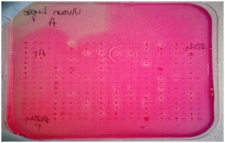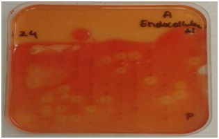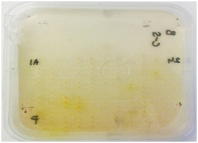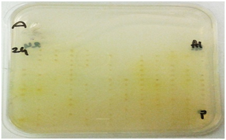 Cellulases screening: Screening for cellulases was done using techniques described by Hurek BR et al. 19, Organisms were grown on DifcoTM Marine Agar 2216 plates in the 384 well plate format for 48 hours. An overlay consisting of 20 ml of pH 7.0 0.05 M potassium phosphate (Sigma-Aldrich, United Kingdom) buffered agarose (0.7%) (Bio-Rad, United Kingdom) containing 0.5mg/ml of 4-Methylumbelliferyl-3-cellobioside (Sigma-Aldrich, United Kingdom) for exocellulases, 1% CMC sodium salt of medium viscosity (Sigma-Aldrich, United Kingdom) for endocellulases and 5 mM 4-Nitrophenyl-β-D-glucopyranoside (Sigma-Aldrich, United Kingdom) for β-glucosidase screening was poured on the plates. These plates were incubated with the overlays at 15 OC for approximately 6 hours. Plates to be screened for exocellulases were exposed to UV light. Active colonies were identified by the presence of fluorescence under UV. Plates to be screened for endocellulases were developed with 1% w/v Congo red (Sigma-Aldrich, United Kingdom and activity was identified by appearance of a clear yellowish halo on a red background. β-glucosidase activity was detected by appearance of yellow halo around the positive clones.