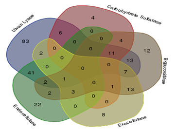 Of the total 849 strains screened for five enzymes required for the saccharification of cellulose and ulvan, 235 tested positive for one or more enzymes. Ulvan lyases were present in 166 strains, while carbohydrate sulfatases were present in 26 strains, β-glucosidases in 69 strains, endocellulases in 70 strains and exocellulases in 34 strains Figure 1. Illustrates the results of the screenings carried out for detecting the activity of the above mentioned enzymes. Venn diagram indicating the overall number of organism with single activity as well as number of organisms with more than one of the five enzyme activities screened for is illustrated in Figure 2.