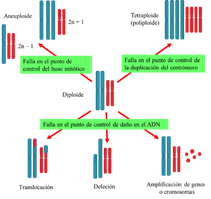 The malfunction of the mitotic spindle can lead to aneuploidy, while an error in centrosome duplication can lead to polyploidy. Failures at the DNA damage checkpoints (Figure 1) can result in chromosomal aberrations of various types, including translocations, deletions, and amplifications of genes or chromosome regions. Amplified genes can be found as tandem repeats within a chromosome or extrachromosomal circles that lack a centromere as well as telomeres.3