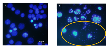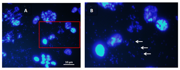 Figure 2 Doble minutes (DMs) in interphase célls: A) Panoramic view of nuclei brilliantly stained with Hoechst 33258. Note the small opaque spheres around the nuclei that are in pairs. B) field extension. White arrows indicate doble minute chromosomes. 1000x.