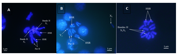 Figure 3 A) Female metaphase X1X1 with homogeneously stained regions( HSR); B) Male metaphase X1Y1 with HSR. C) Female X1X1 with HSR.