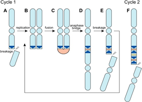 During this work, events related to tiny double chromosomes, such as anaphase bridges (Figures 4A&4B) and micronuclei (Figure 5) were found. How are these events related? One of the hypotheses that explains how genes are amplified is the breakage-fusion-bridge cycle model (Breakage-Fusion-Bridge = BFB) originally proposed by Barbara McClintock in 1941 (Figure 7).